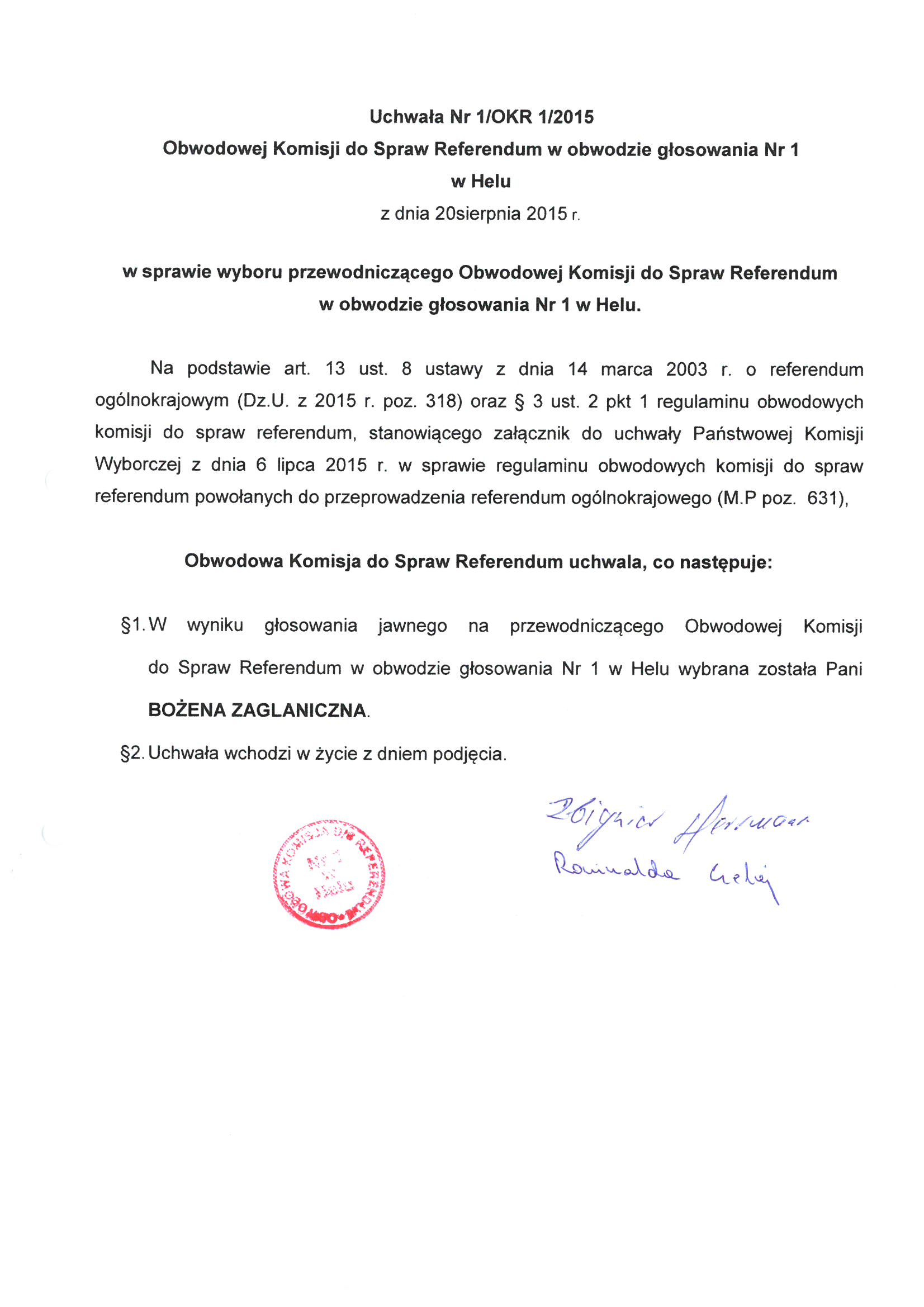 Uchwała Nr 1/OKR 1/2015 Obwodowej Komisji do Spraw Referendum w obwodzie głosowania Nr 1 w sprawie wyboru przewodniczącego Obwodowej Komisji do Spraw Referendum w obwodzie głosowania Nr 1 w Helu.