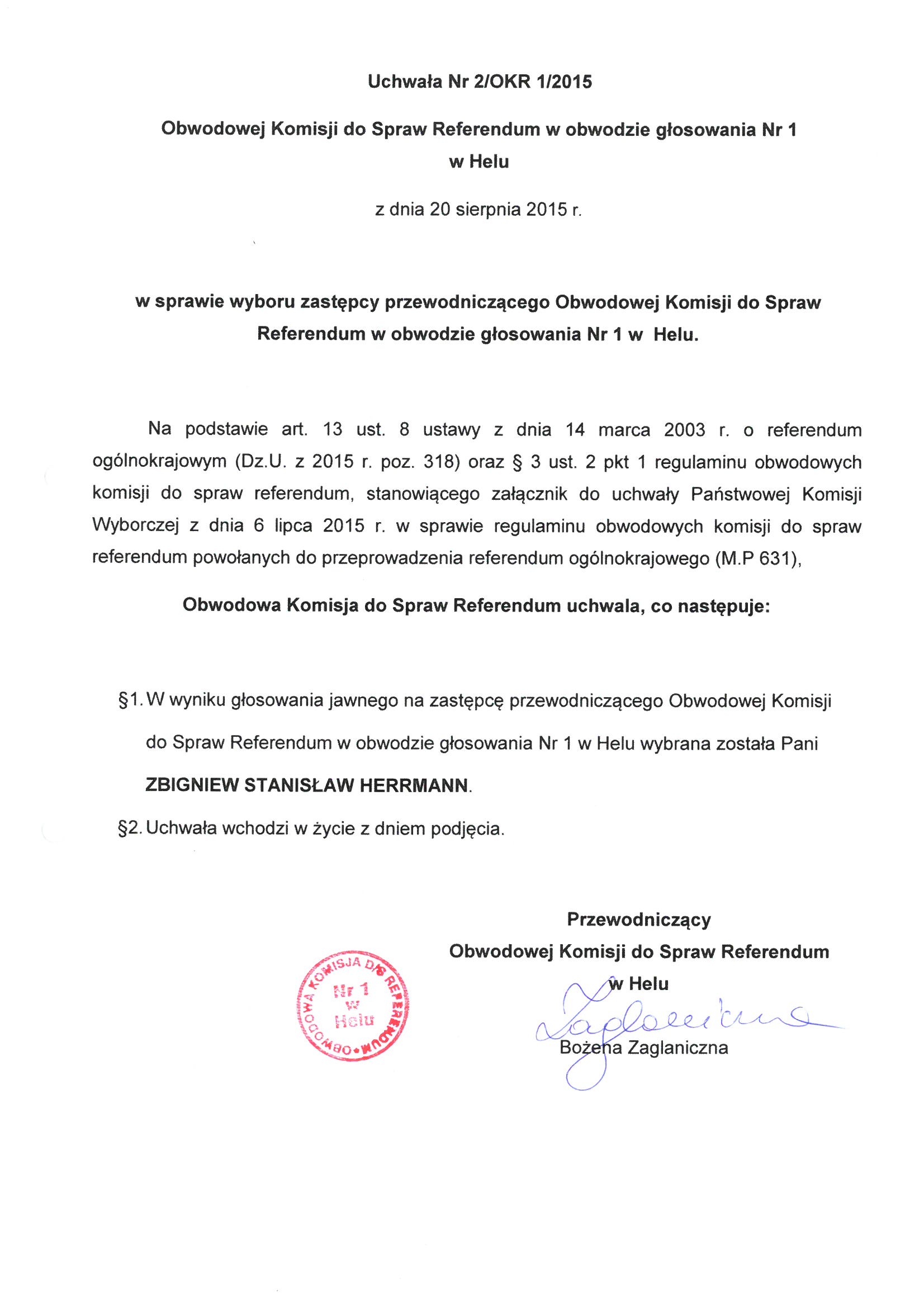 Uchwała Nr 2/OKR 1/2015 Obwodowej Komisji do Spraw Referendum w obwodzie głosowania Nr 1 w Helu w sprawie wyboru zastępcy przewodniczącego Obwodowej Komisji do Spraw Referendum w obwodzie głosowania Nr 1 w Helu.
