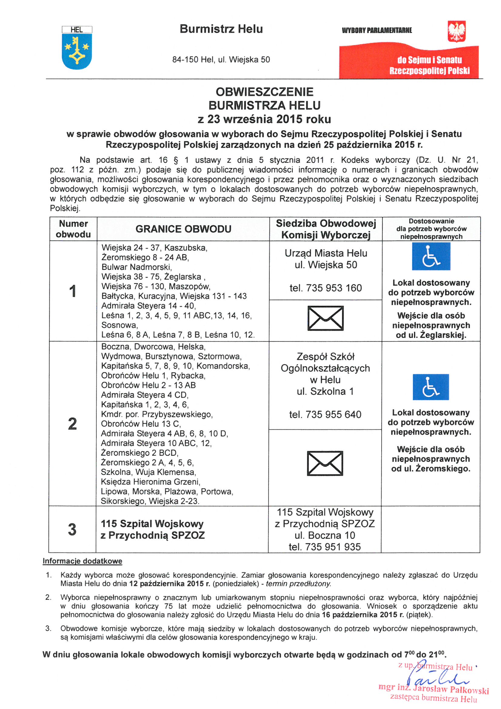 Obwieszczenie Burmistrza Helu z 23 września 2015 roku w sprawie obwodów głosowania w wyborach do Sejmu Rzeczypospolitej Polskiej i Senatu Rzeczypospolitej Polskiej zarządzonych na dzień 25 października 2015 r.