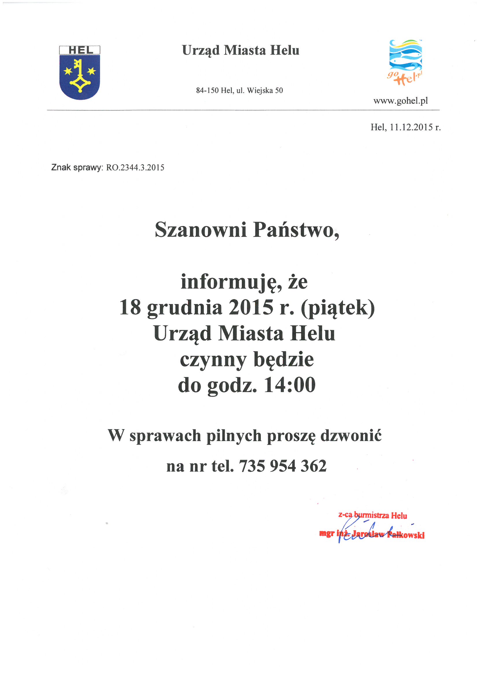 18.12.2015 r. Urząd Miasta Helu czynny będzie do godz. 14:00.