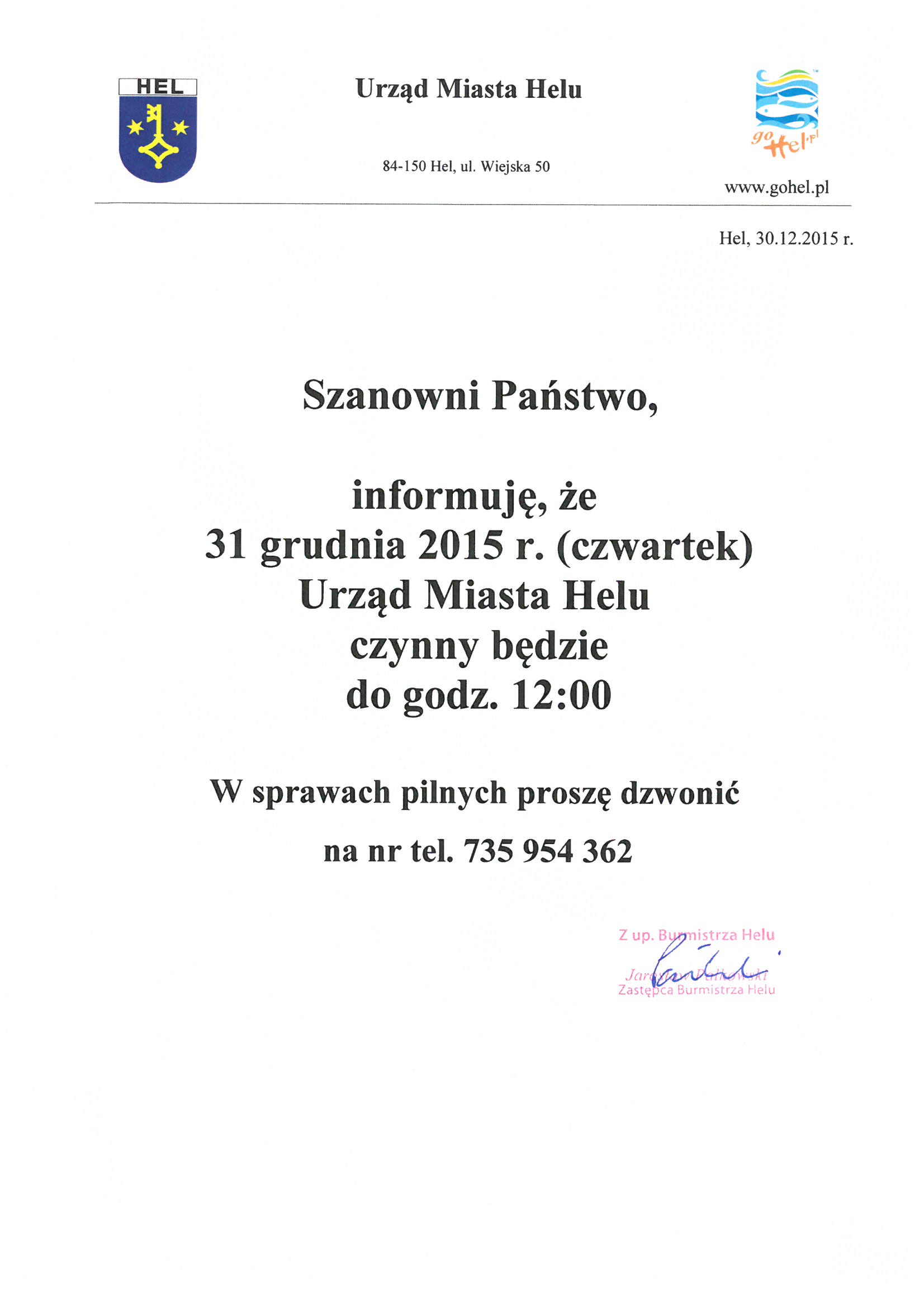 31 grudnia 2015 r. Urząd Miasta czynny będzie do godz. 12:00