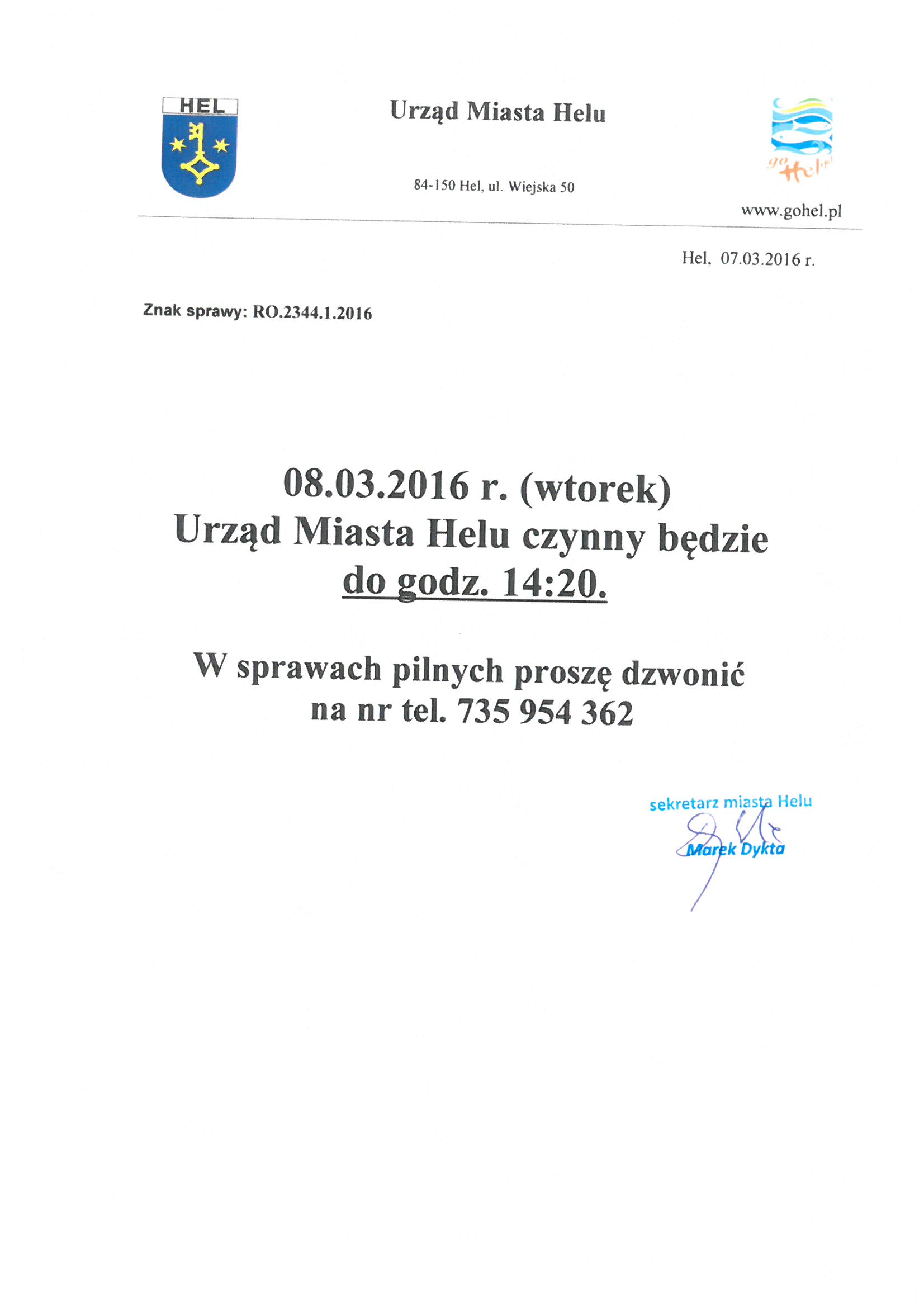 8 marca 2016 r. Urząd Miasta czynny będzie do godz. 14:20.