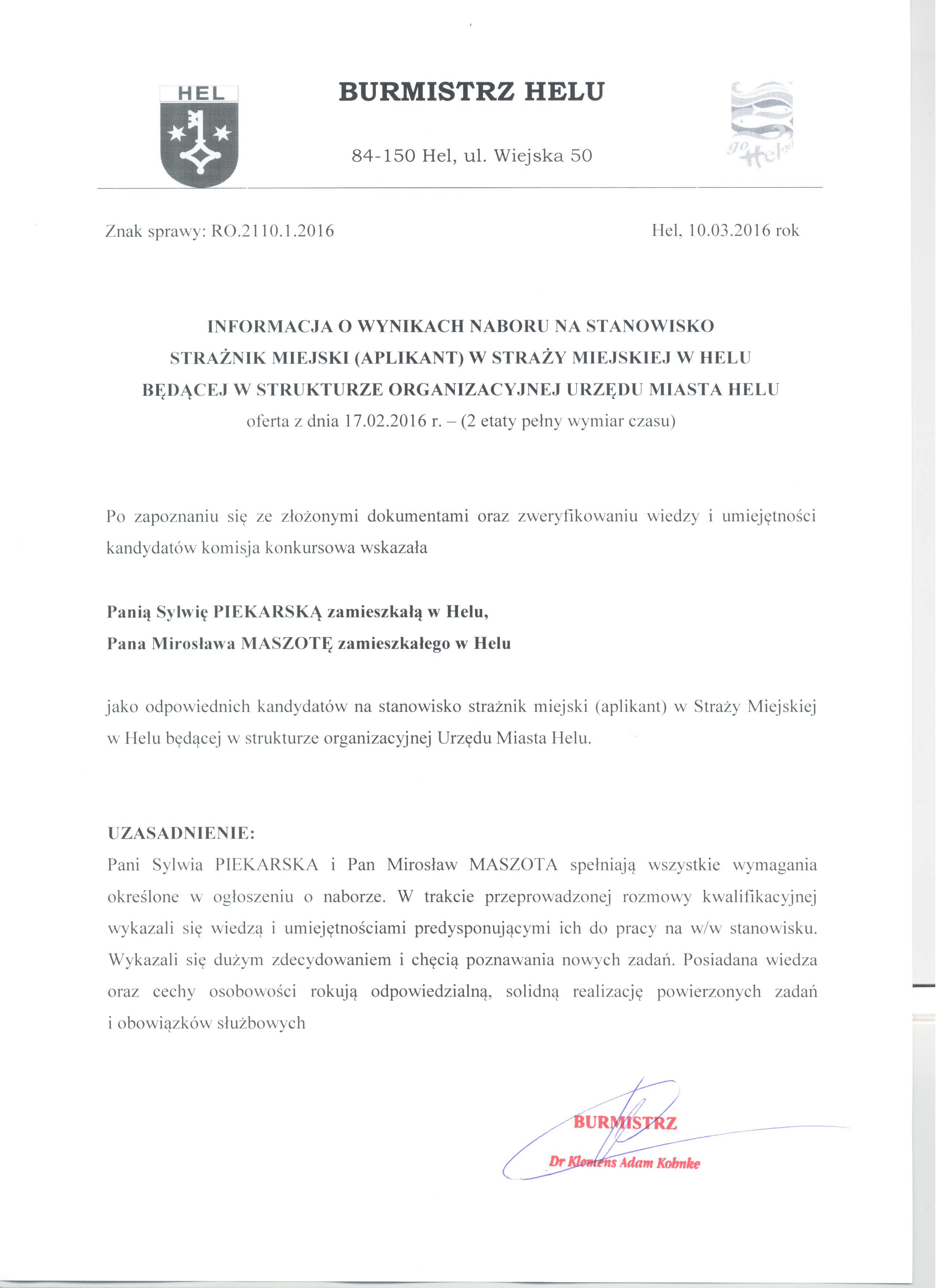 Informacja o wynikach naboru na stanowisko Strażnik Miejski (aplikant) w Straży Miejskiej w Helu będącej w strukturze organizacyjnej Urzędu Miasta Helu