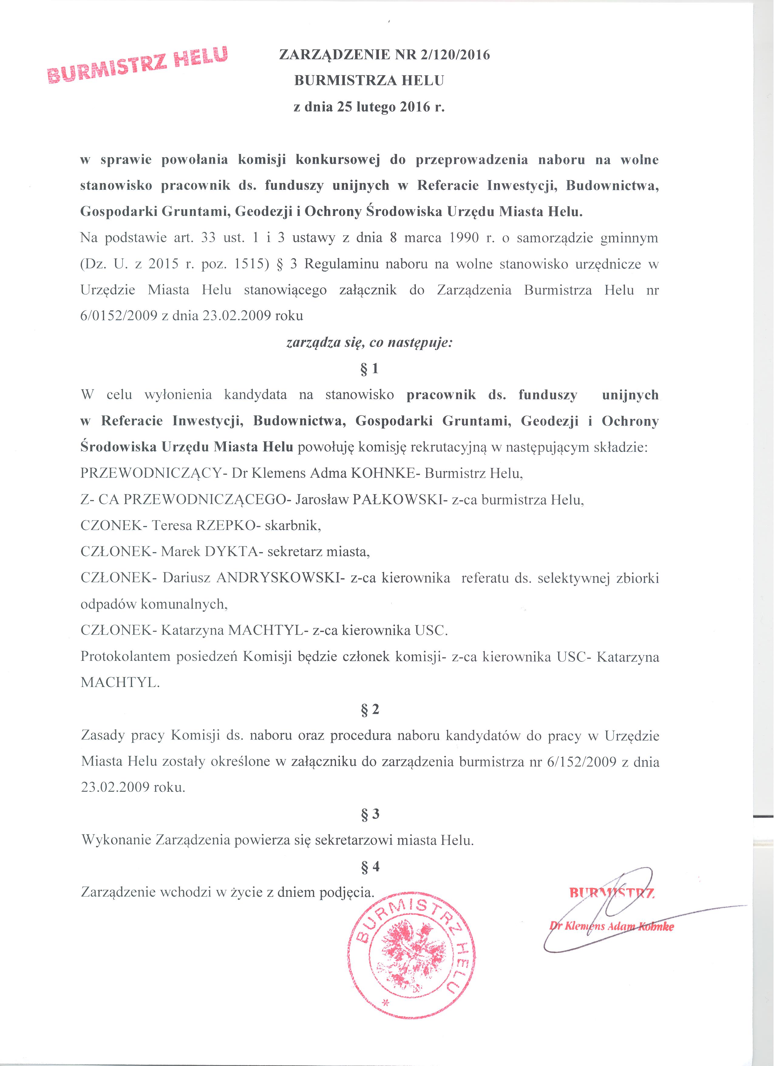 ZARZĄDZENIE NR 2/120/2016 BURMISTRZA HELU Z DNIA 25 LUTEGO 2016 R. W SPRAWIE POWOŁANIA KOMISJI KONKURSOWEJ DO PRZEPROWADZENIA NABORU NA WOLNE STANOWISKO DS. FUNDUSZY UNIJNYCH W REFERACIE INWESTYCJI, BUDOWNICTWA, GOSPODARKI GRUNTAMI, GEODEZJI I OCHORNY ŚRODOWISKA URZĘDU MIASTA HELU.
