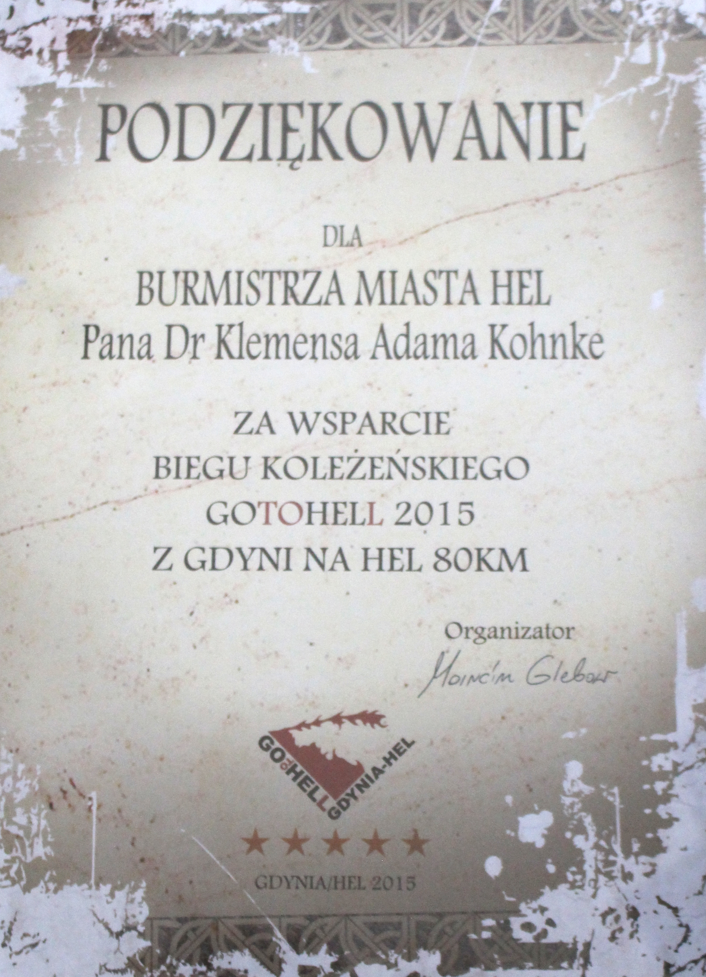 GotoHell 2015 - Podziękowania dla Burmistrza Miasta Helu za wsparcie biegu koleżeńskiego