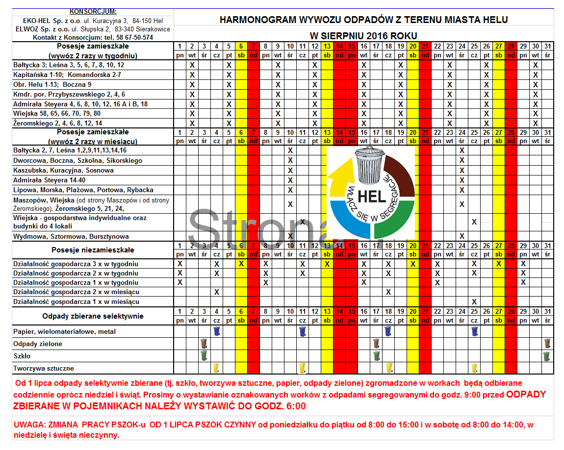 2016.08 - harmonogram wywozu odpadów komunalnych z terenu miasta Helu w miesiącu sierpień 2016 r.