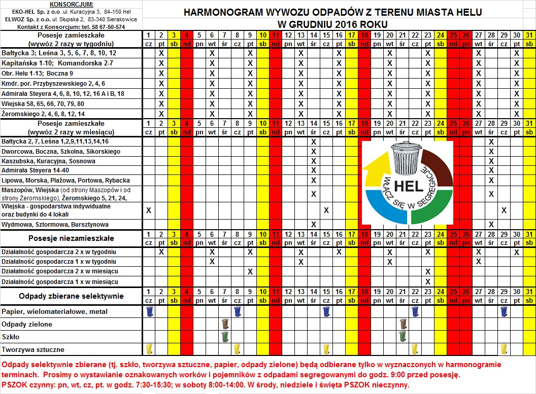 2016.12 - harmonogram wywozu odpadów komunalnych z terenu miasta Helu w miesiącu grudzień 2016 r.