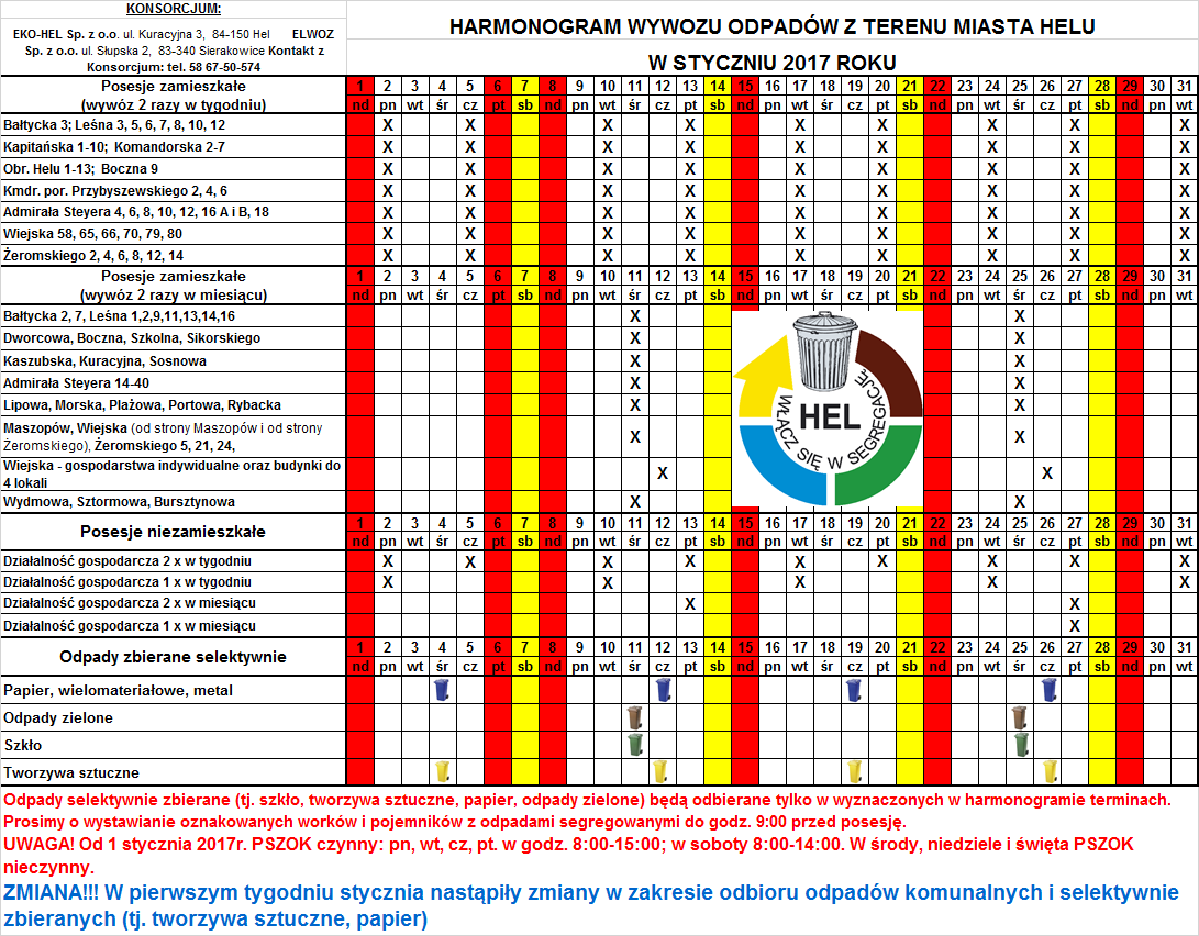 2017.01 - harmonogram wywozu odpadów komunalnych z terenu miasta Helu w miesiącu styczeń 2017 r.