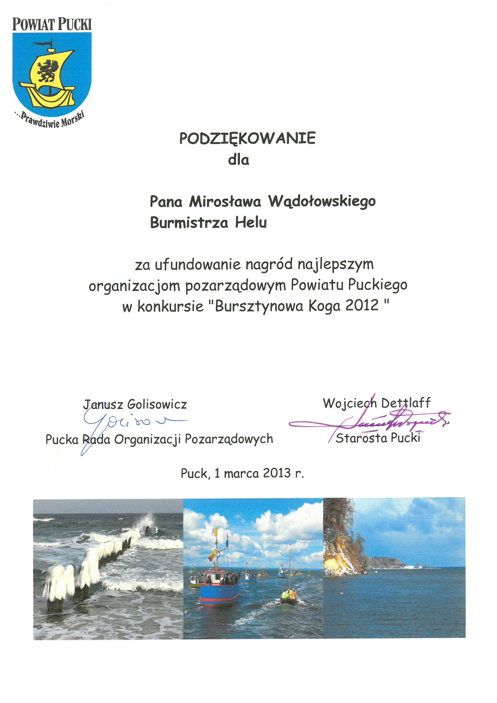 Podziękowanie za ufundowanie nagród najlepszym organizacjom pozarządowym Powiatu Puckiego w konkursie "Bursztynowa Koga 2012"