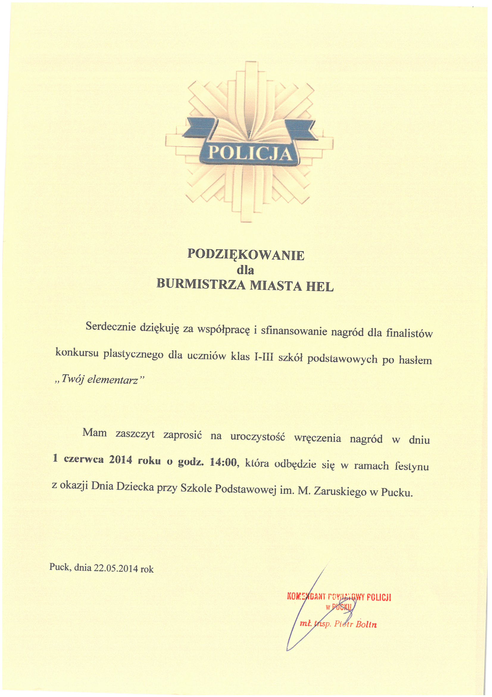 Podziękowania dla Burmistrza Miasta Hel za współpracę i sfinansowanie nagród konkursu "Twój elementarz"