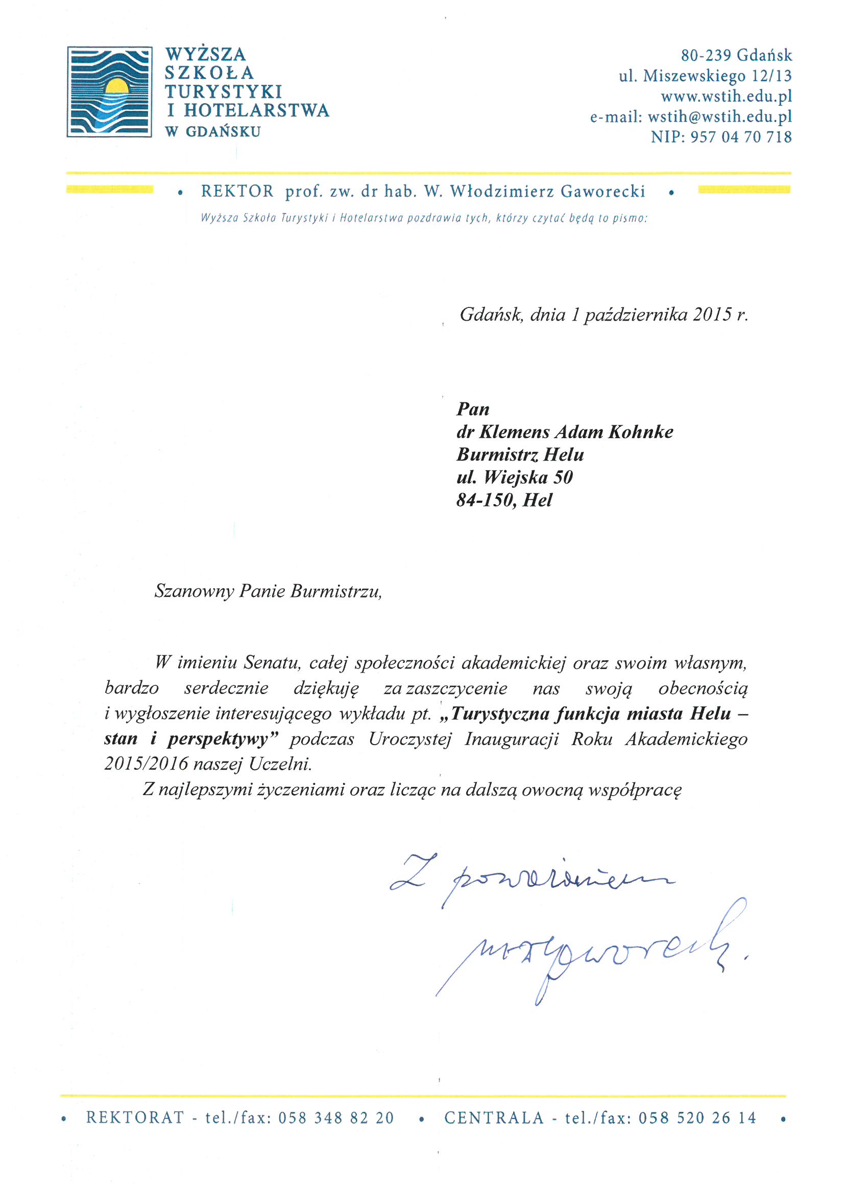Podziękowania za obecność i wykłaf pt. "Turystyczna funkcja miasta Helu - stan i perspektywy"
