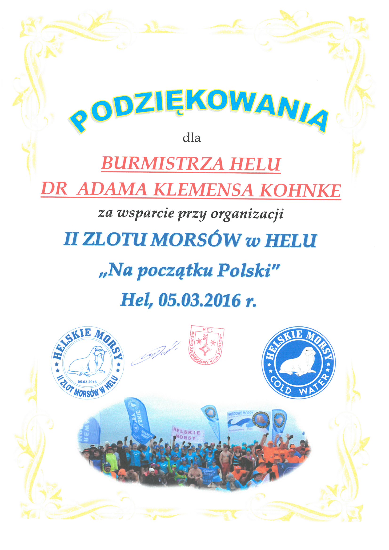 Podziękowania dla Burmistrza Helu za wsparcie przy organizacji II Zlotu Morsów w Helu