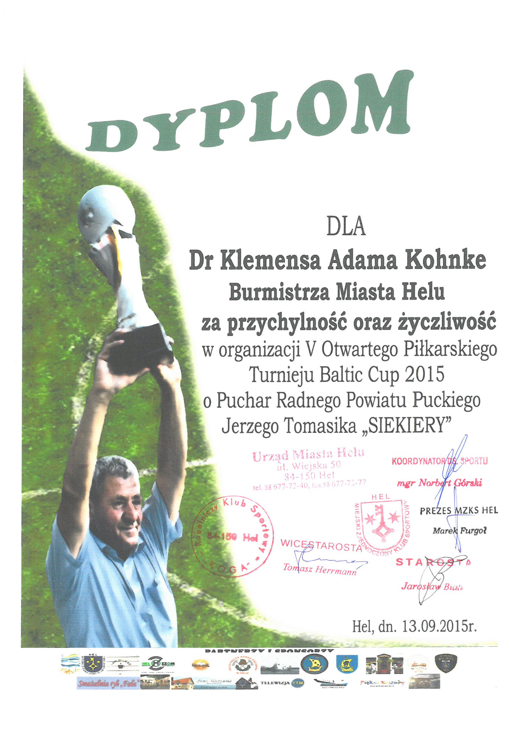 Dyplom dl Burmistrza Miasta Helu za przychylnosć oraz życzliwość w organizacji V Otwartego Piłkarskiego Turnieju Baltic Cup 2015
