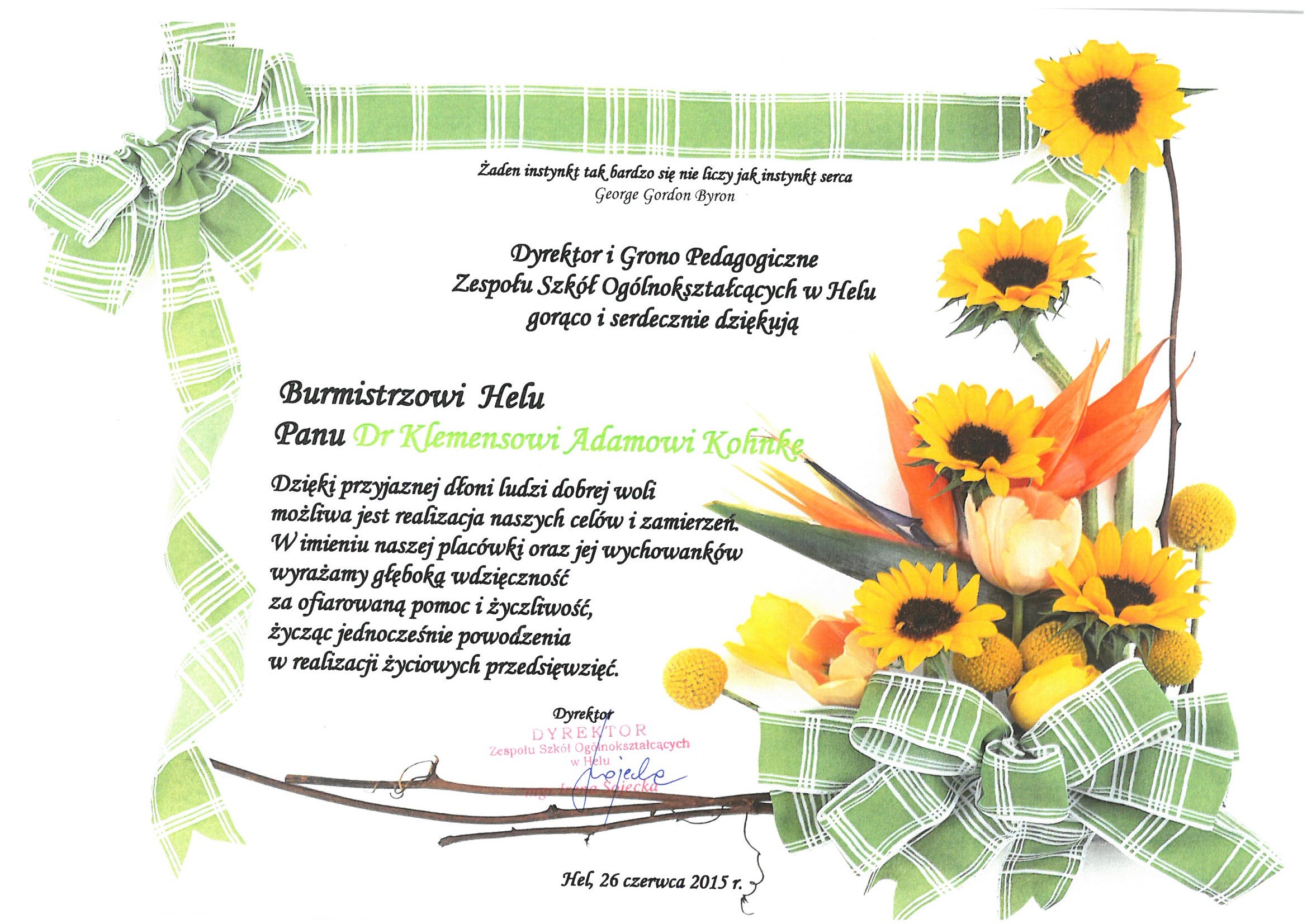 Podziękowania Burmistrzowi Helu za pomoc i życzliwość od Dyrektor i Grona Pedagogicznego ZSO w Helu