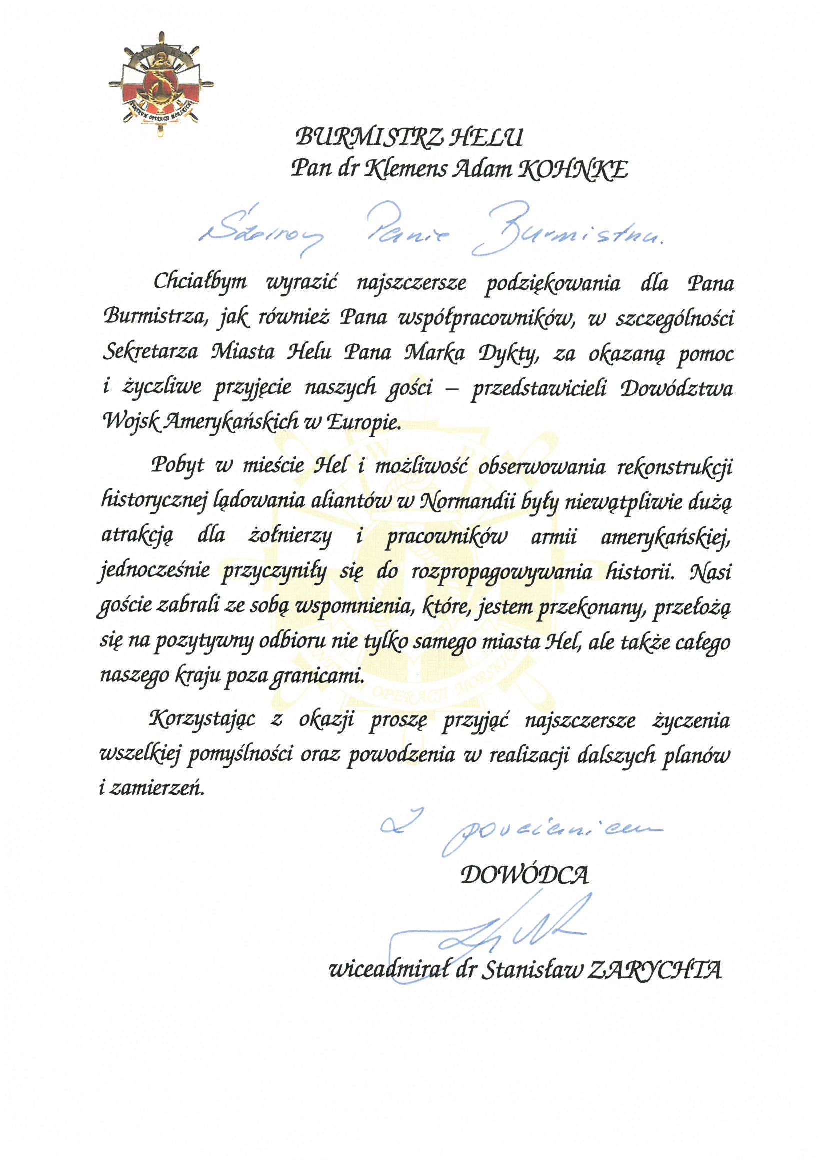 Podziękowania dla Burmistrza Helu i współpracowników za pomoc i życzlie przyjęcie przedstawicieli Dowództwa Wojsk Amerykańskich w Europie