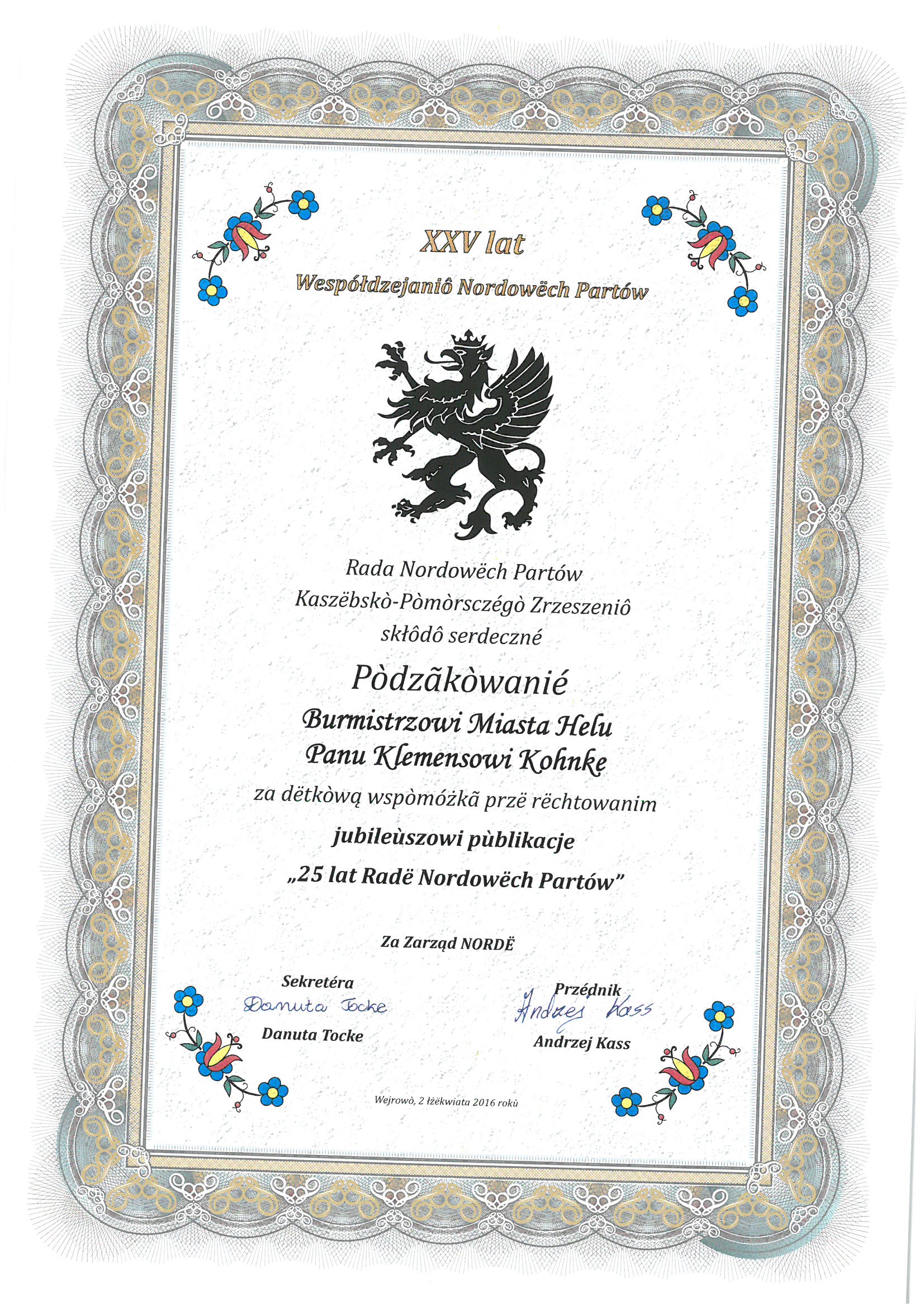 Podziękowania dla Burmistrza Miasta Helu za pomoc przy organizacji jubileuszu "25 lat Rade Nordowech Partów"