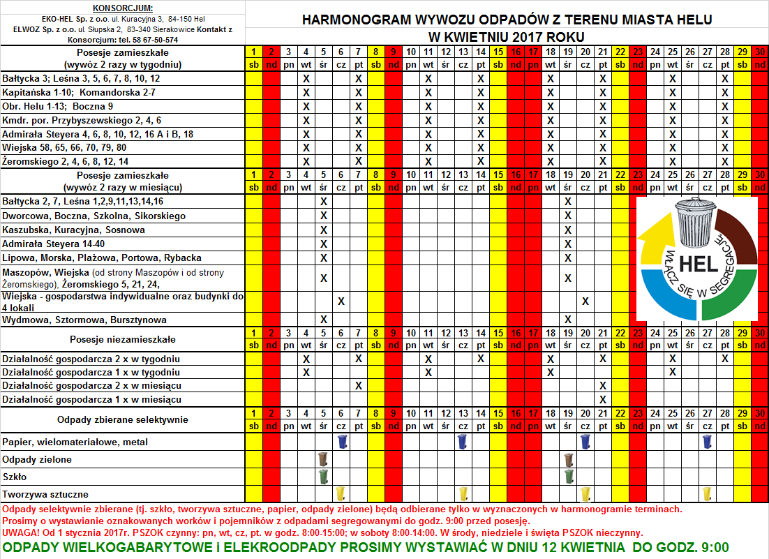 2017.04 - harmonogram wywozu odpadów komunalnych z terenu miasta Helu w miesiącu kwiecień 2017 r.
