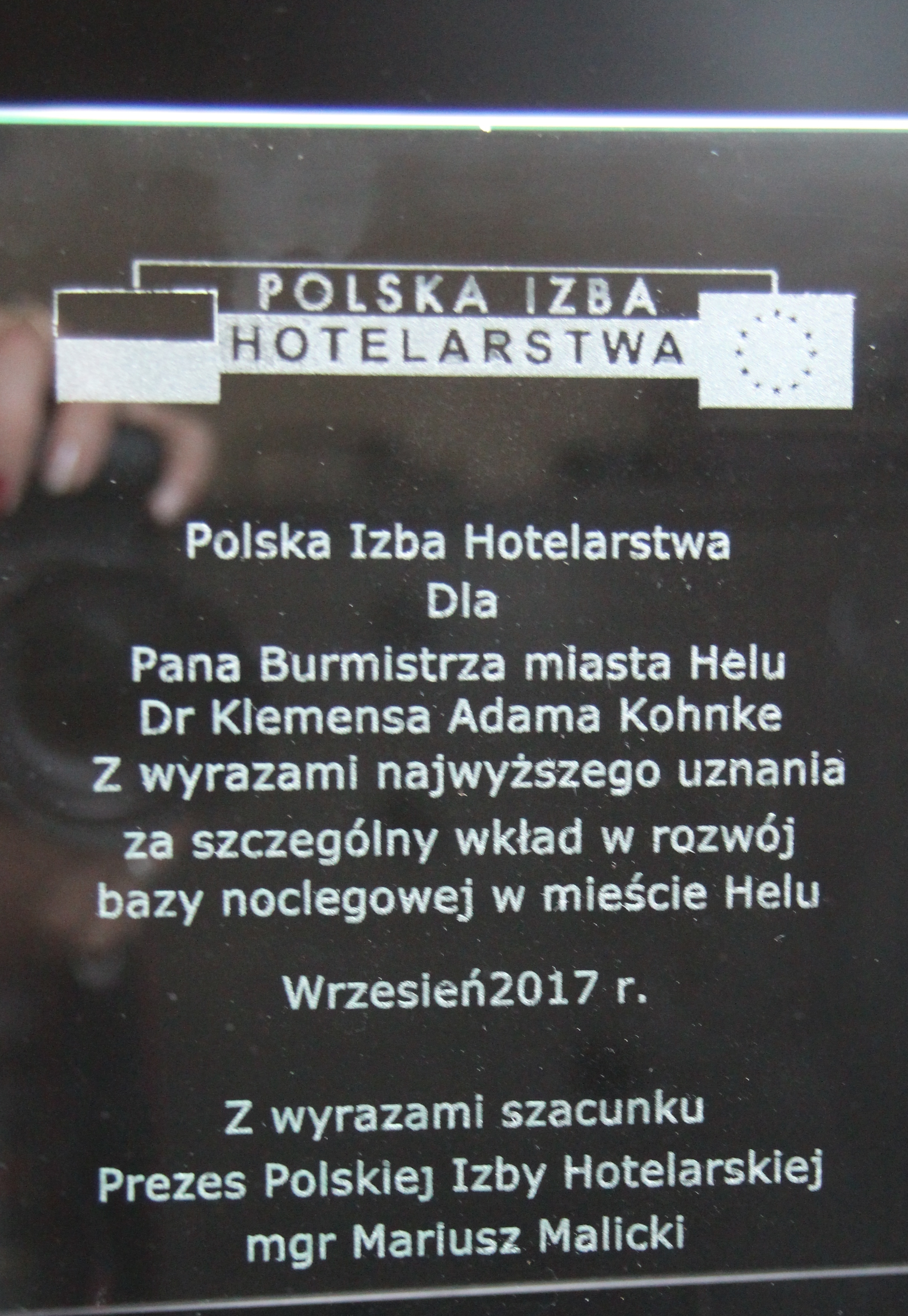 Polska Izba Hotelarstwa dla Burmistrza Helu Dr Klemensa Adama Kohnke - wyrazy uznania za szczególny wkład w rozwój bazy noclegowej w Helu