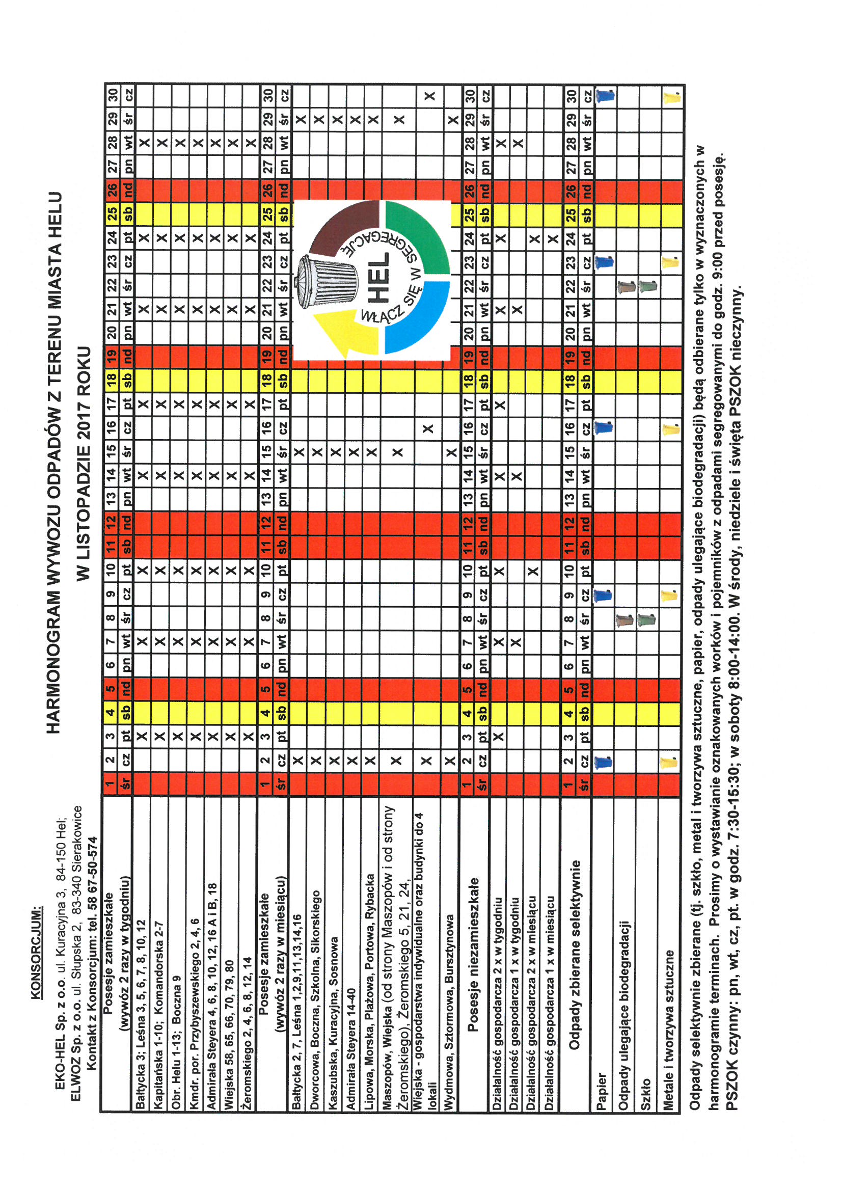 2017.11 - harmonogram wywozu odpadów komunalnych z terenu miasta Helu w listopadzie 2017 r.